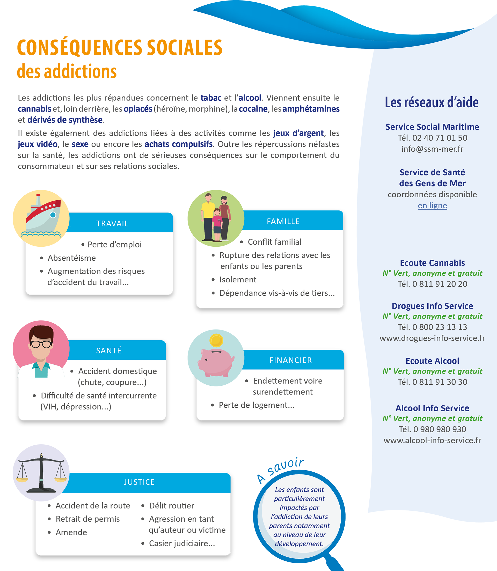 Vous y trouverez un état des lieux de la consommation de substances psychoactives (alcool, cannabis, autres drogues...) dans le secteur maritime, les risques disciplinaires et judiciaires auxquels le marin s'expose ainsi que l'aide à apporter à un marin dans un état anormal à bord.