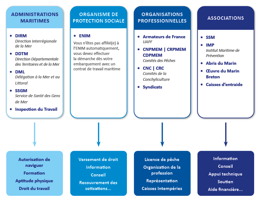 Pour information, dans les territoires d'Outre-Mer les institutions maritimes peuvent avoir des noms différents que ceux énumérés ci-dessus.